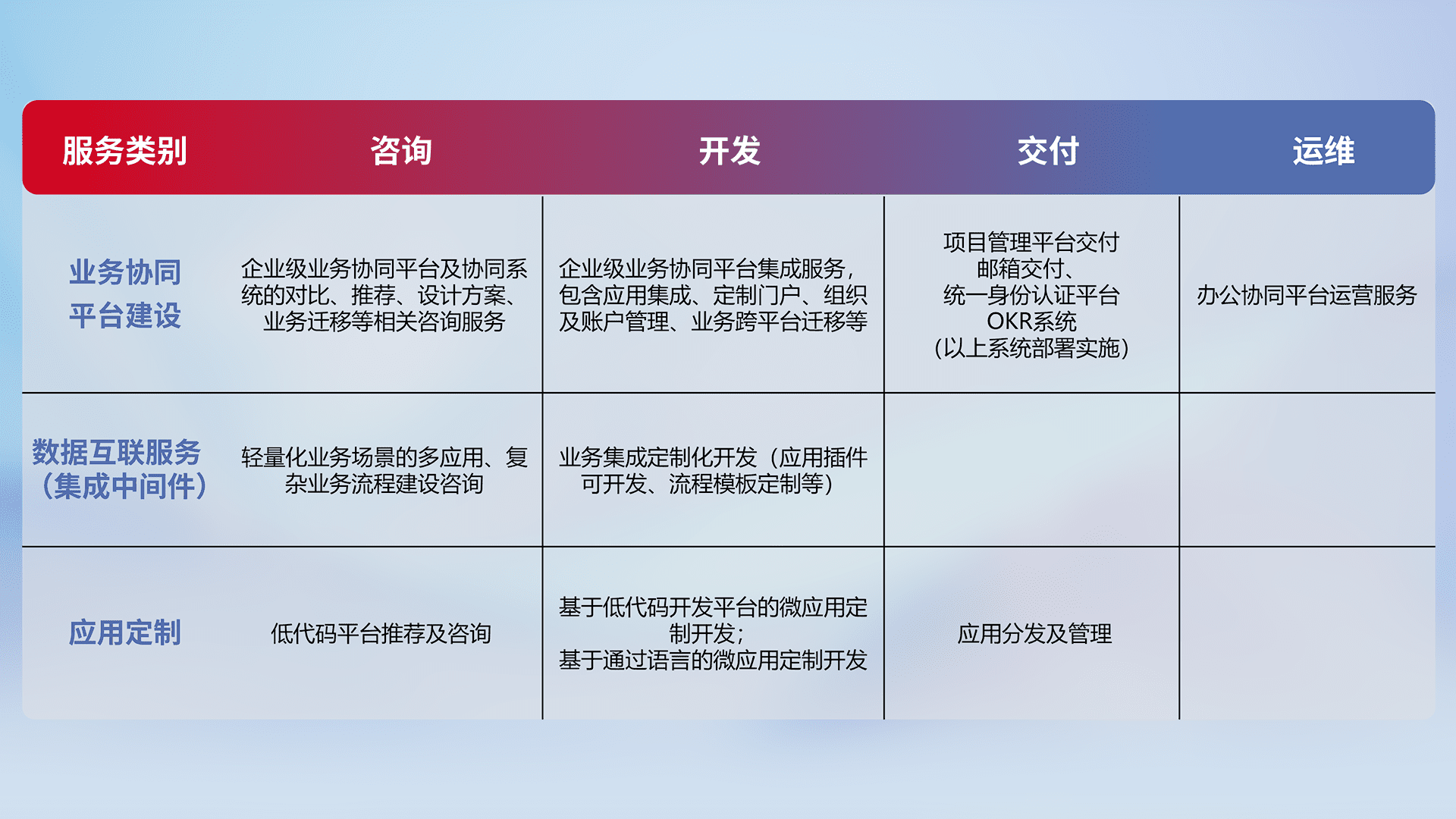 针对钉钉、、企微、、、、IDaas等平台级产品提供产品的规划、、、、方案、、、、交付、、、定制化开发等服务,,,,实现如统一协同办公、、、智能客户服务、、、、混合会议管理、、、、智能数据查询、、、等业务场景,,,,实现数字化转型。。。