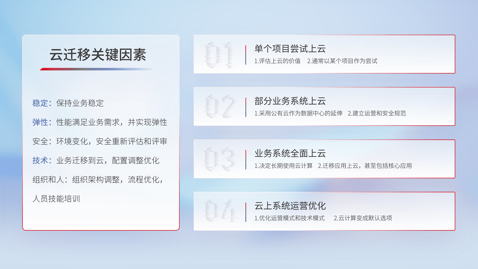 结合实际业务,,,从规划设计、、云平台选型、、、、云原生改造、、、数据迁移、、、、集成交付,,,,迁移全过程为客户识别最佳上云路径,,,做好风险识别管理,,,,设计网络架构、、、身份权限、、、安全审计合规、、操作审计、、、、日志审计、、监控告警策略、、、多站点容灾设计等,,,,对云上基础设施进行整体规划,,,,提升IT治理水平,,,以满足弹性、、高可用、、、、高性能的需求。。。