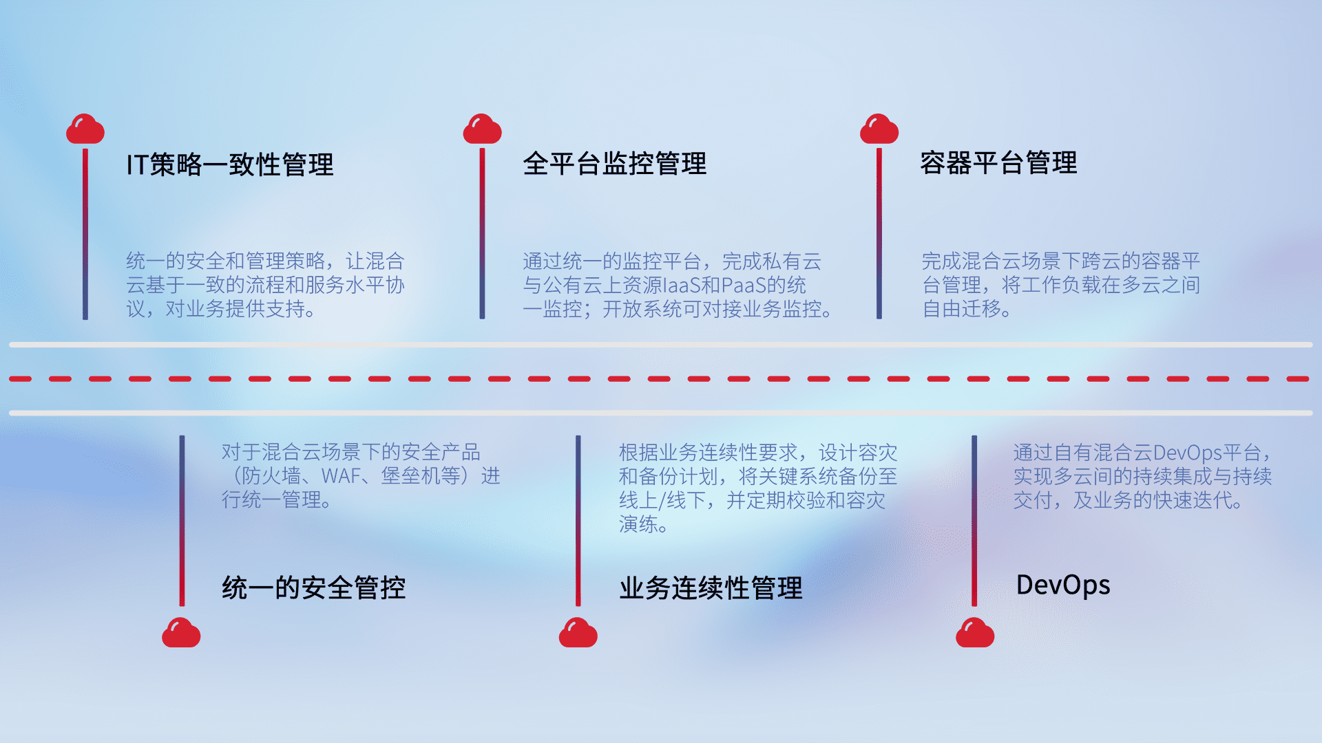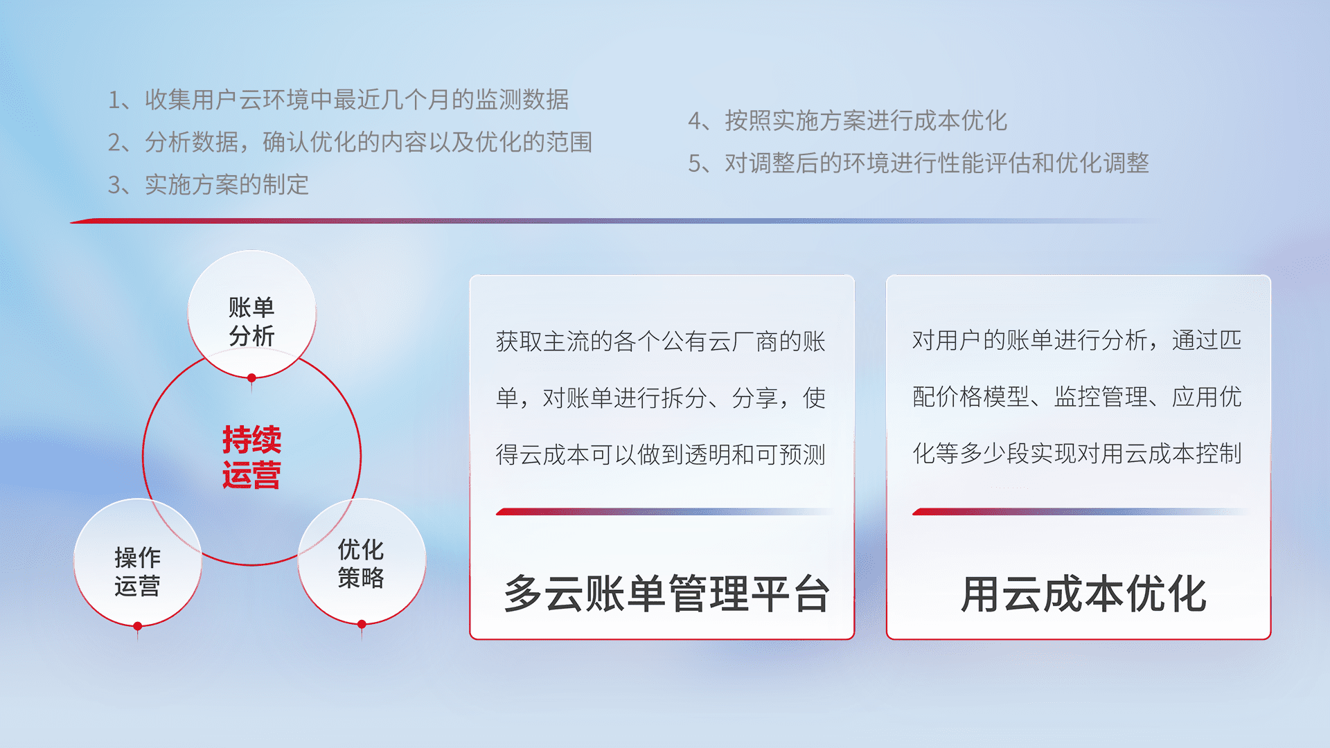 通过多云纳管,,以统一的资源数据模型把客户的云资源进行抽象和封装,,,,进而实现对多云资源的统一操作,,保障云资源管理的可靠性、、、、稳定性与可用性。。。量身定制化运维内容,,,,配置、、、、开发运维、、、补丁管理、、、、备份、、、、监控、、、认证和访问管理、、、、审计和日常巡检等,,保障在用云过程中的可靠度,,,,稳定度以及高可用率。。。。
